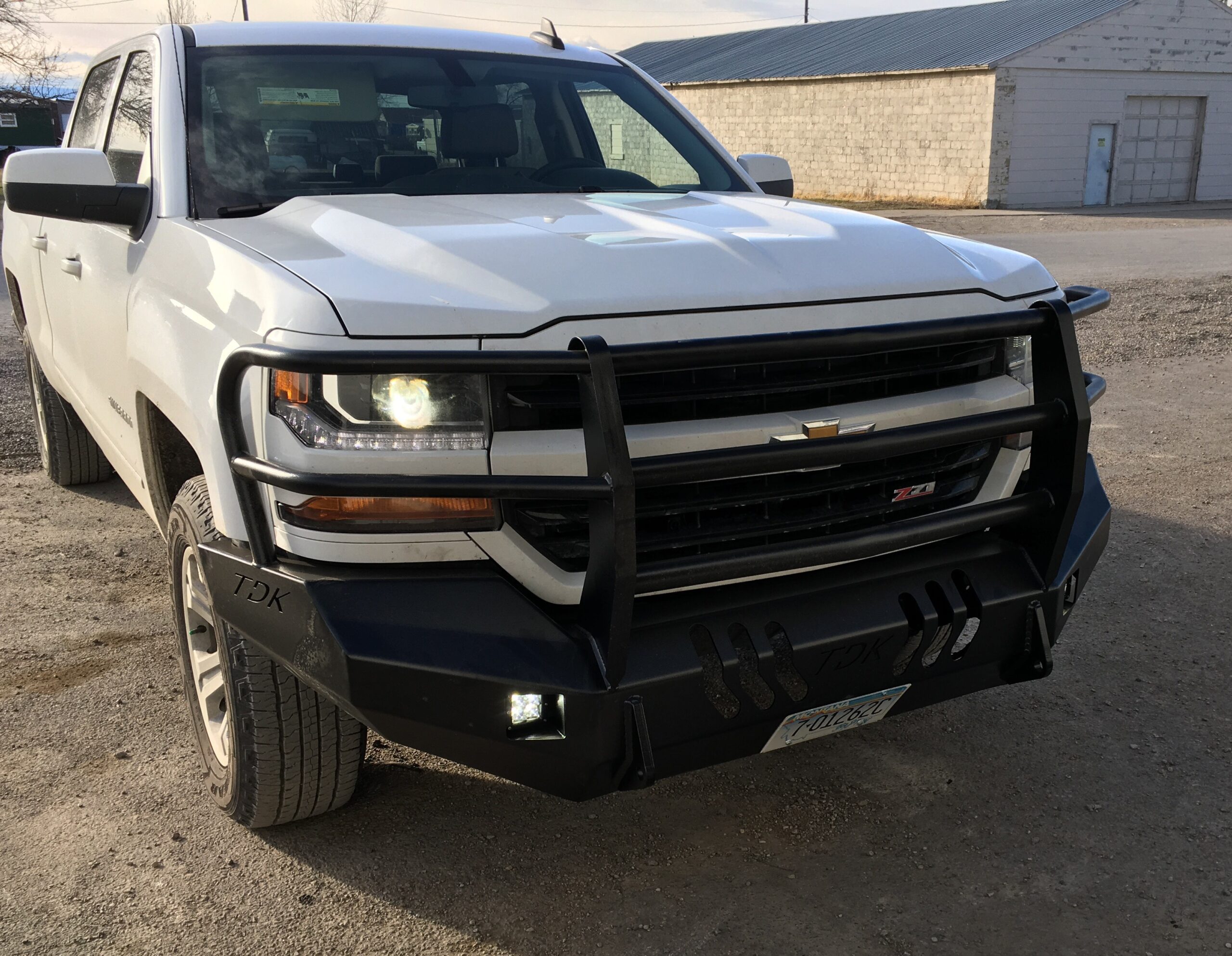If your Silverado faces tough road conditions and hard work, a Throttle Down Kustoms custom steel bumper with a grille guard helps protect your vehicle’s front end. In addition to durability, a custom TDK bumper with a grille guard also adds some rugged style. Certified professionals mig weld these bumpers by hand right here in the USA.