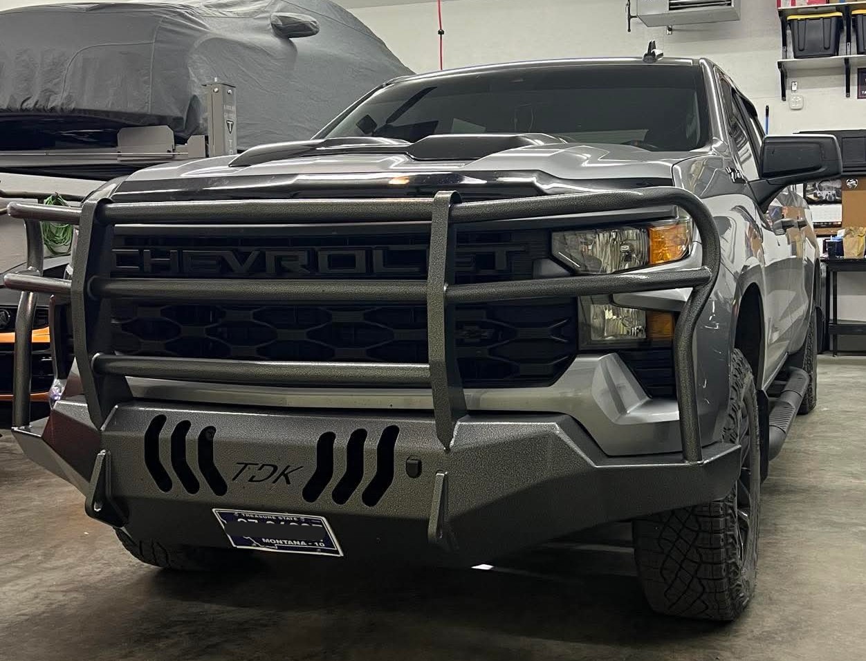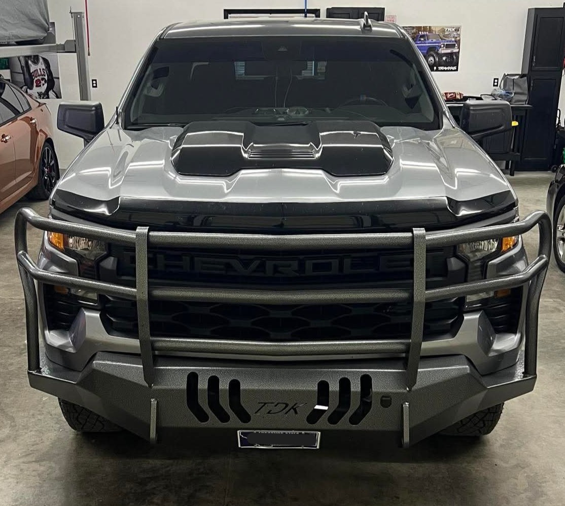 If your Silverado faces tough road conditions and hard work, a Throttle Down Kustoms custom steel bumper with a grille guard helps protect your vehicle’s front end. In addition to durability, a custom TDK bumper with a grille guard also adds some rugged style. Certified professionals mig weld these bumpers by hand right here in the USA.